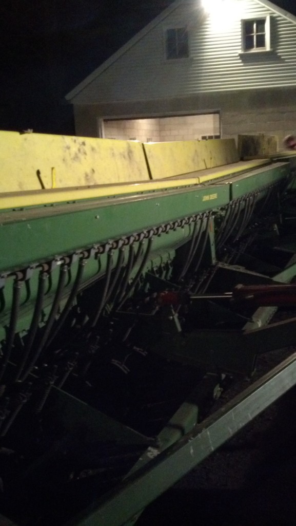 Grain drill with lids open