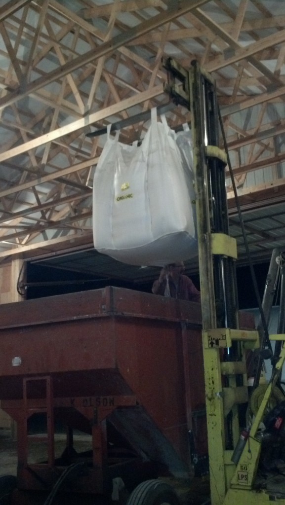 Emptying a mini-bulk into the seed tender wagon